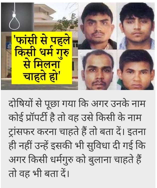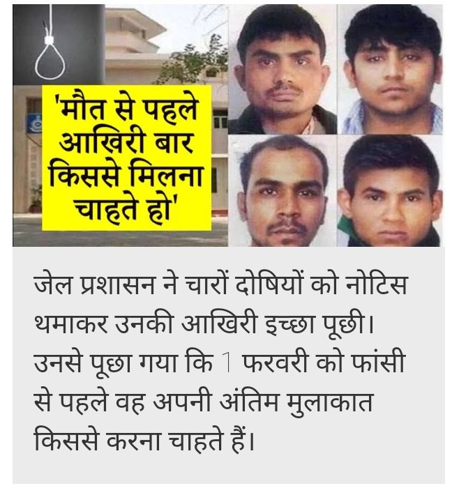 इच्छा पूछ रहा है, लेकिन दोषी आखिरी इच्छा नहीं बता रहे हैं।उनमें मौत का डर इस कदर बैठ गया है कि दोषी विनय ने तो 2 दिन से खाना-पीना भी छोड़ दिया है।