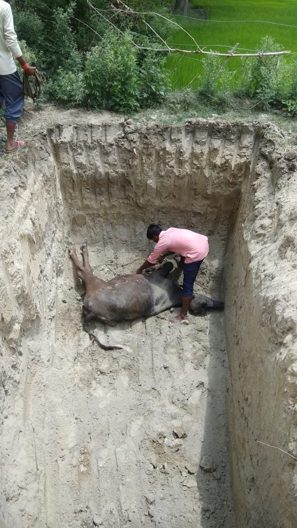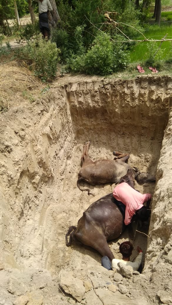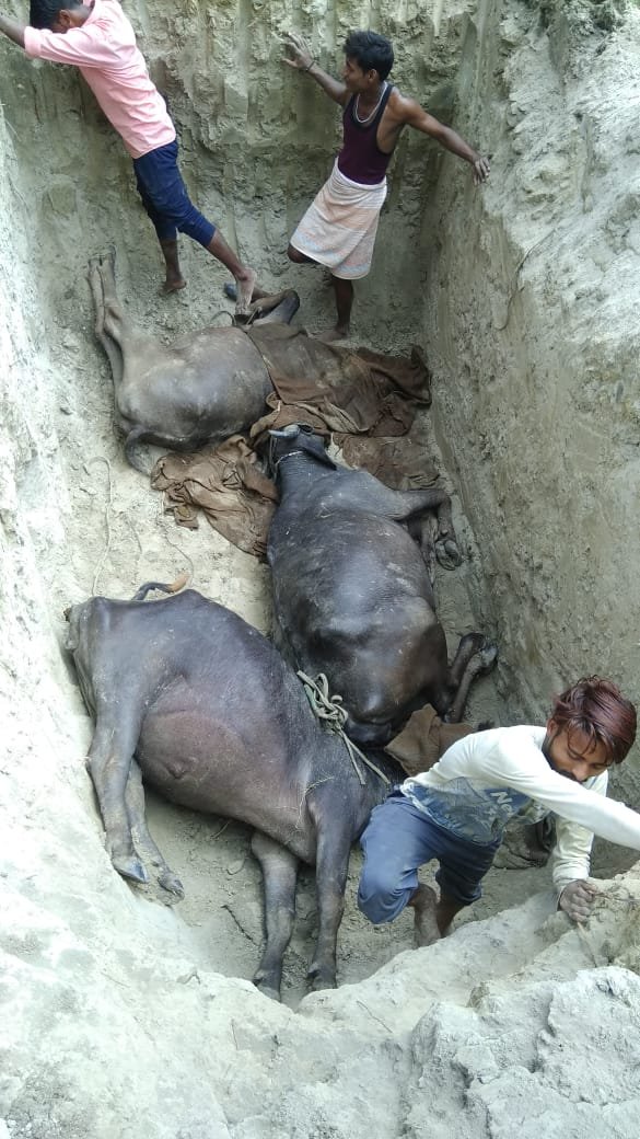 विद्युत विभाग की लापरवाही से 2 मवेशियों की मौत।करंट लगने से मौत,लोहे के खम्भे में करंट उतरने से गाय एवं बछड़े की घटना स्थल पर हुई मौत,लोहे के खम्भे में उतरता है करंट,स्थानीयों ने विद्युत विभाग से की थी शिकायत,करंट उतर रहे खम्भे के बगल शुक्रवार एवं मंगलवार को लगती है सब्जी बाजार,रौनाही थाना क्षेत्र के ड्योढ़ी बाजार टैक्सी स्टैंड के पास का मामला।